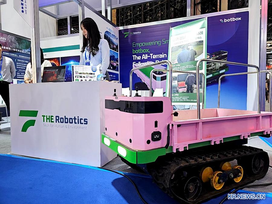 함정빈 더로보틱스 사업운영팀 매니저는 주로 농업 분야에 응용되는 자율주행 운반로봇을 소개했다. 그는 농산물을 수확할 때 제품이 리모컨을 소지한 작업자를 정밀하게 추종하며 작업 효율을 크게 높여준다고 말했다. 제품은 현재 제주도 감귤 수확 농장에 이미 투입돼 사용되고 있다.