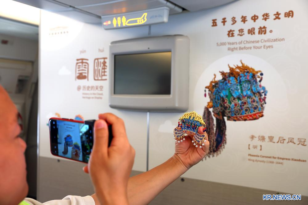 28일 관계자가 국가박물관 테마로 설계된 '궈보(國博)호' 항공기에서 봉관(鳳冠) 냉장고 마그네틱을 휴대전화 카메라에 담고 있다.