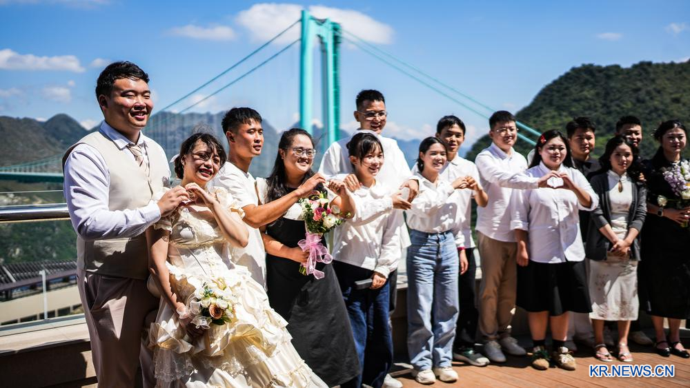 28일 결혼증을 받은 신혼부부가 윈두(雲渡)휴게소 포토존에서 구이저우(貴州) 화장(花江)협곡대교를 배경으로 기념사진을 찍고 있다.