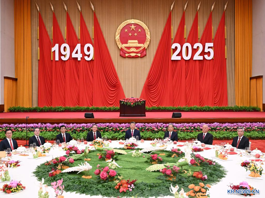 중화인민공화국 건국 76주년 경축 리셉션이 30일 저녁 베이징 인민대회당에서 성황리에 열렸다.[촬영/신화사 기자 셰환츠(謝環馳)]