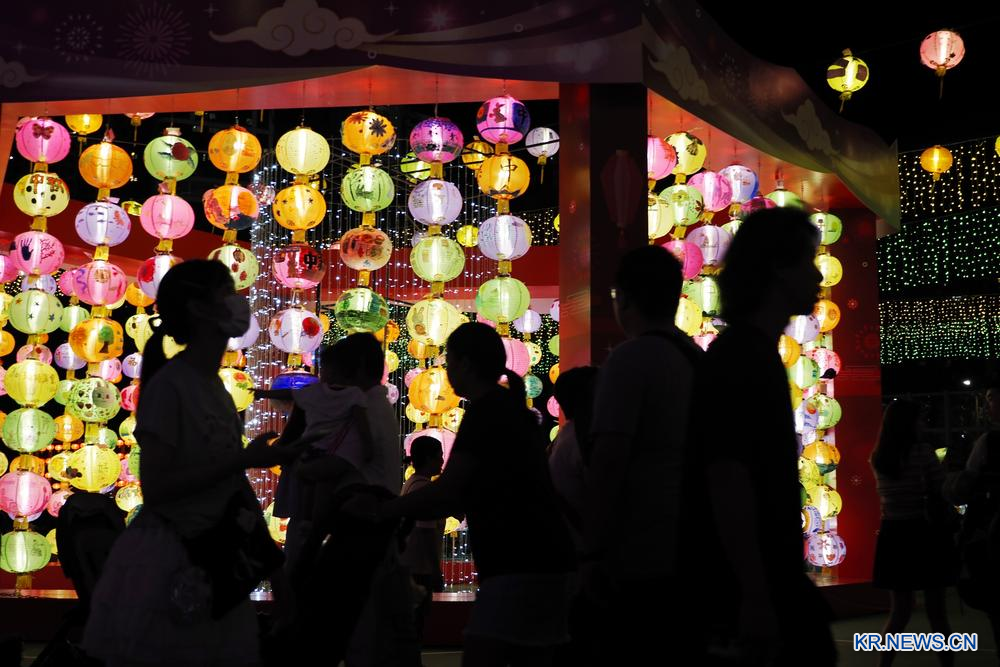 [신화망 홍콩 10월1일] 9월 30일 홍콩 빅토리아공원을 찾은 사람들이 꽃등을 둘러보고 있다.