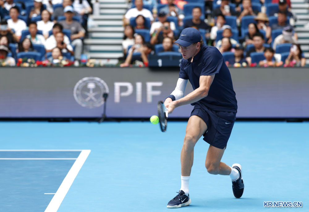 1일 베이징에서 열린 2025 차이나오픈 남자단식 결승전에서 시너가 티엔의 공을 시너가 경기에서 공을 되받아 치고 있다.
