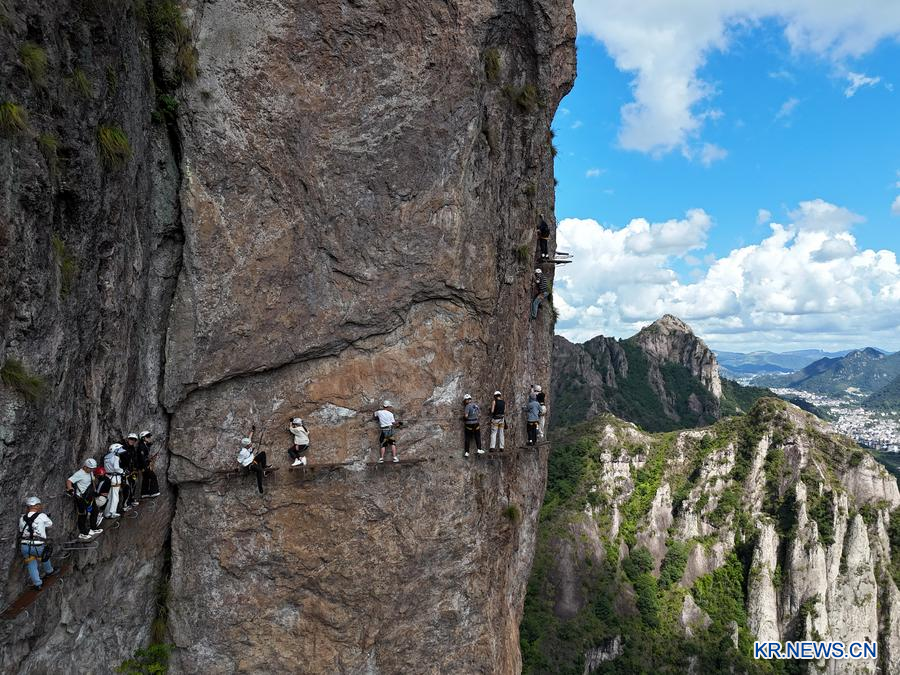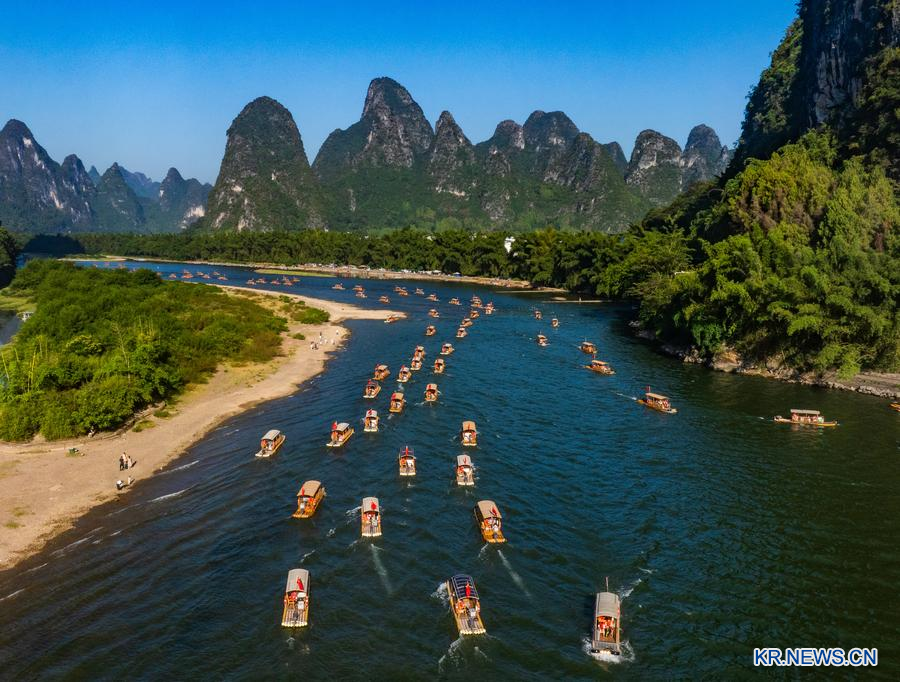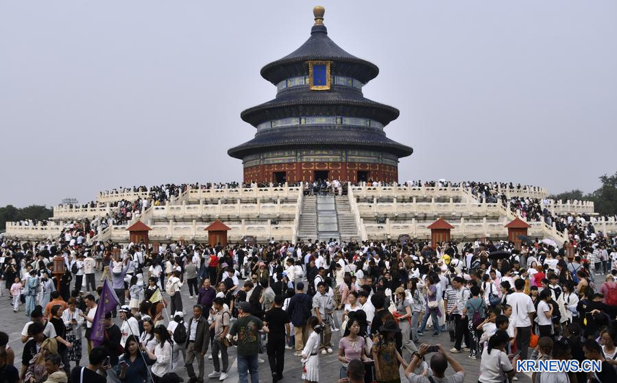 4일 베이징 톈탄(天壇)공원을 찾은 여행객들. (사진/신화통신)4일 여행객들이 허베이(河北)성 청더(承德)시 싱룽(興隆)현의 한 꽃밭을 거닐고 있는 모습을 드론으로 담았다. (사진/신화통신) 여행객이 4일 장쑤(江蘇)성 화이안(淮安)시 다윈허(大運河)국가문화공원의 기억관(館)을 참관하고 있다. (사진/신화통신)4일 저장(浙江)성 웨칭(樂淸)시에 있는 타핑(沓屏)봉에서 비아페라타(Via Ferrata) 체험을 하고 있는 여행객들을 드론으로 담았다. (사진/신화통신)광시(廣西)좡족자치구에 구이린(桂林)시 양숴(陽朔)현에서 대나무 뗏목을 타고 리장(灕江)을 유람하는 모습을 4일 드론으로 내려다봤다. (사진/신화통신)4일 톈진(天津)시 빈하이(濱海)신구에 위치한 극지해양리조트에서 돌고래쇼를 관람하고 있는 여행객들. (사진/신화통신) 원문 출처:신화통신 한국어 뉴스 서비스