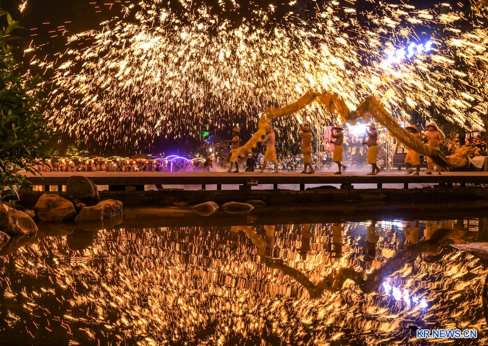 [신화망 베이징 10월7일] 5일 저녁 쓰촨(四川)성 청두(成都)시 황룽시(黃龍溪)고진(古鎭∙옛 마을)에서 민간 예술가들이 관광객에게 무형문화유산 화용등(火龍燈) 춤을 선보이고 있다.