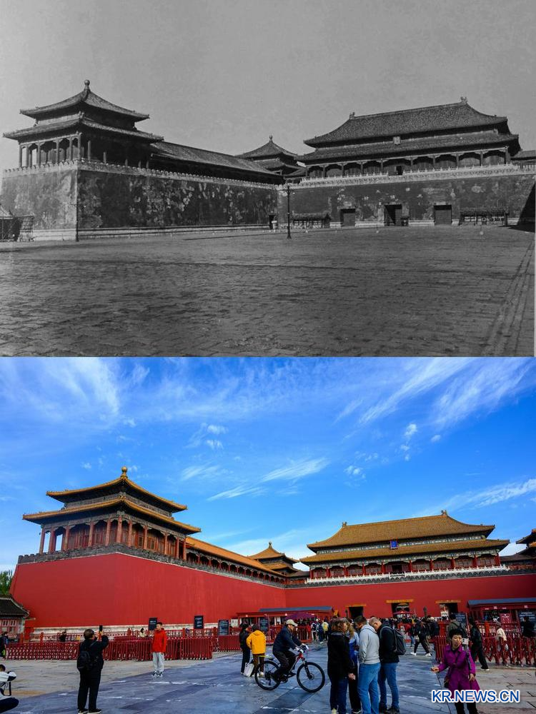 20세기 초(위 사진, 고궁박물원 제공)와 10일(아래 사진) 각각 촬영된 고궁 오문(午門)과 서안시루(西雁翅樓) 모습.