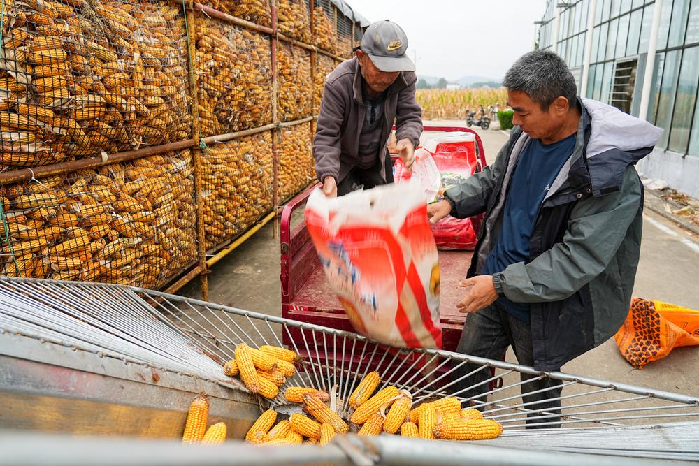 [신화망 이난 10월12일] 11일 산둥(山東)성 이난(沂南)현 장좡(張庄)진의 농민이 수확한 옥수수를 정리하고 있다.