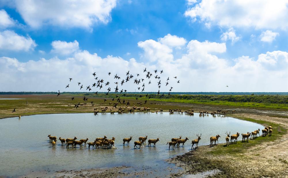 [신화망 베이징 10월12일] 11일 장쑤(江蘇)성 둥타이(東臺)시 탸오쯔니(條子泥)습지에서 철새들이 노니고 야생 사슴들이 한가로이 산책하는 모습을 드론으로 촬영했다.