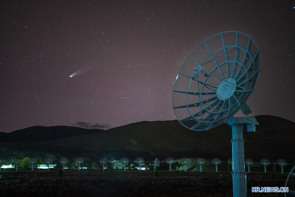 [신화망 다오청 10월22일] 20일 쓰촨(四川)성 다오청(稻城)현 쯔우(子午)공정 2기 원형 배열 태양 전파 이미징 망원경 앞에서 촬영한 C/2025 A6 혜성(일명 레몬 혜성).