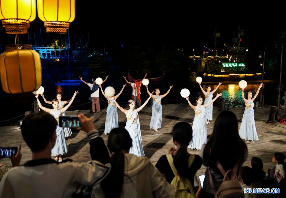 20일 허푸현의 해상 실크로드 출발 항구 관광지에서 관광객들이 공연을 관람하고 있다. 2025.10.21
