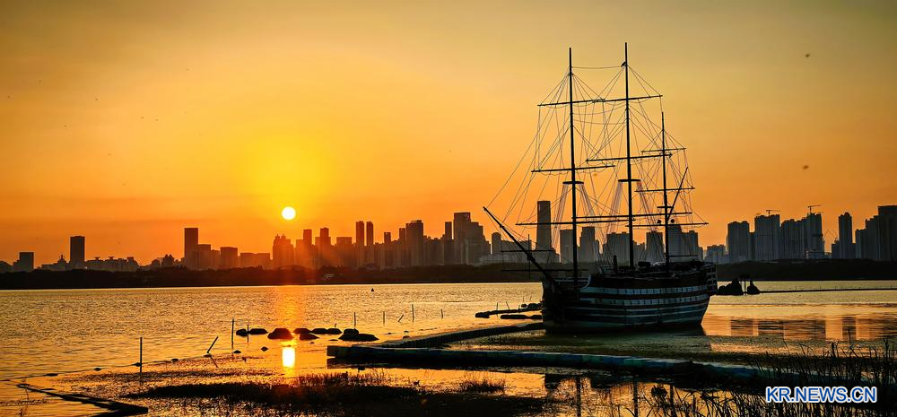 22일 후베이(湖北)성 우한(武漢)시 둥후(東湖) 풍경구에 오렌지빛 석양이 깔리면서 그림 같은 풍경이 펼쳐졌다. 2025.10.22