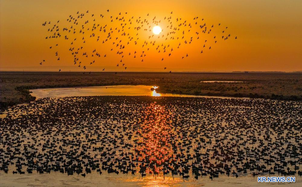 [신화망 하얼빈 10월23일] 최근 헤이룽장(黑龍江)성 각지의 철새 서식지에서 많은 철새가 남쪽으로 이동하면서 장관이 연출되고 있다.