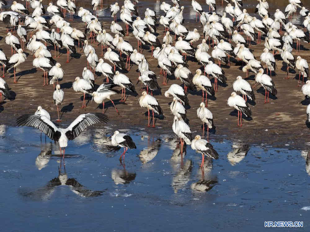 22일 헤이룽장(黑龍江)성 쑹화(松花)강 습지에 무리를 지어 몰려있는 황새.