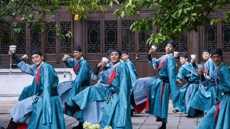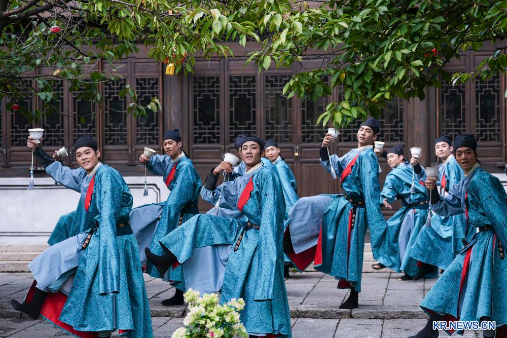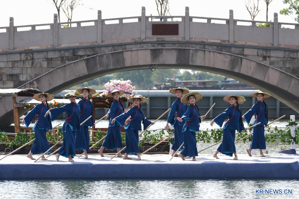 [신화망 더칭 10월25일] 24일 저장(浙江)성 더칭(德清)현 신스(新市) 고진(古鎭∙옛 마을)에서 개막한 '제2회 신스 고진 무용예술제'에서 무용극을 공연 중인 저장음악학원 배우들.