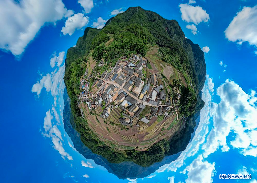 23일 차마고도의 옛 도로를 간직하고 있는 쿵췌핑촌의 모습을 드론 360도 파노라마뷰(VR)로 내려다봤다. 2025.10.24