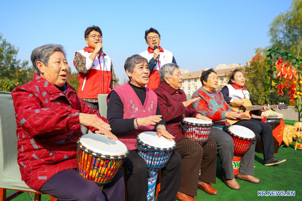 28일 산둥(山東)성 칭다오(青島)시 리창(李滄)구의 사회복지원이 개최한 테마 행사에서 자원봉사자와 노인들이 공연을 선보이고 있다. 2025.10.28