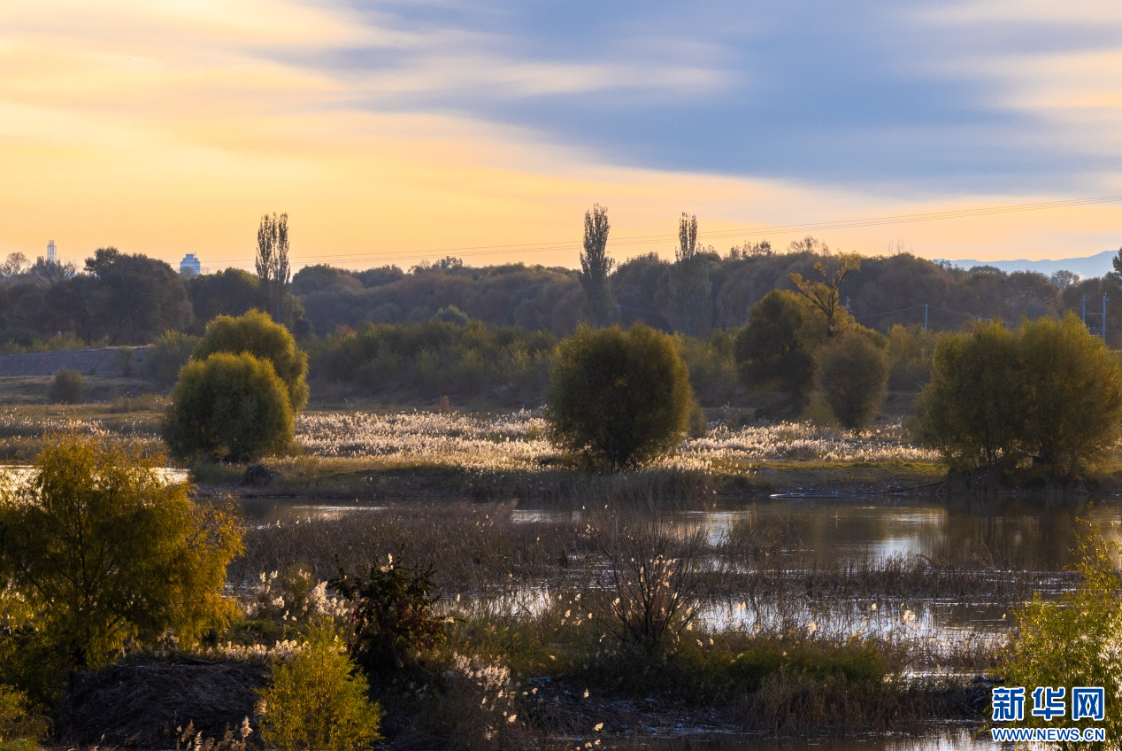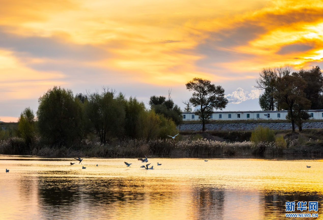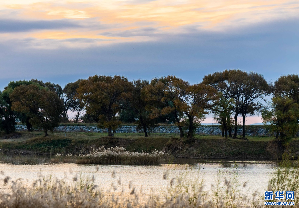 [신화망 베이징 10월29일] 늦가을의 네이멍구(內蒙古)자치구 후허하오터(呼和浩特)시 위취안(玉泉)구 다헤이강 교외공원이 강물에 비친 붉은 노을, 가을바람에 춤추는 새들이 어우러져 매혹적인 가을 풍경을 연출하고 있다.