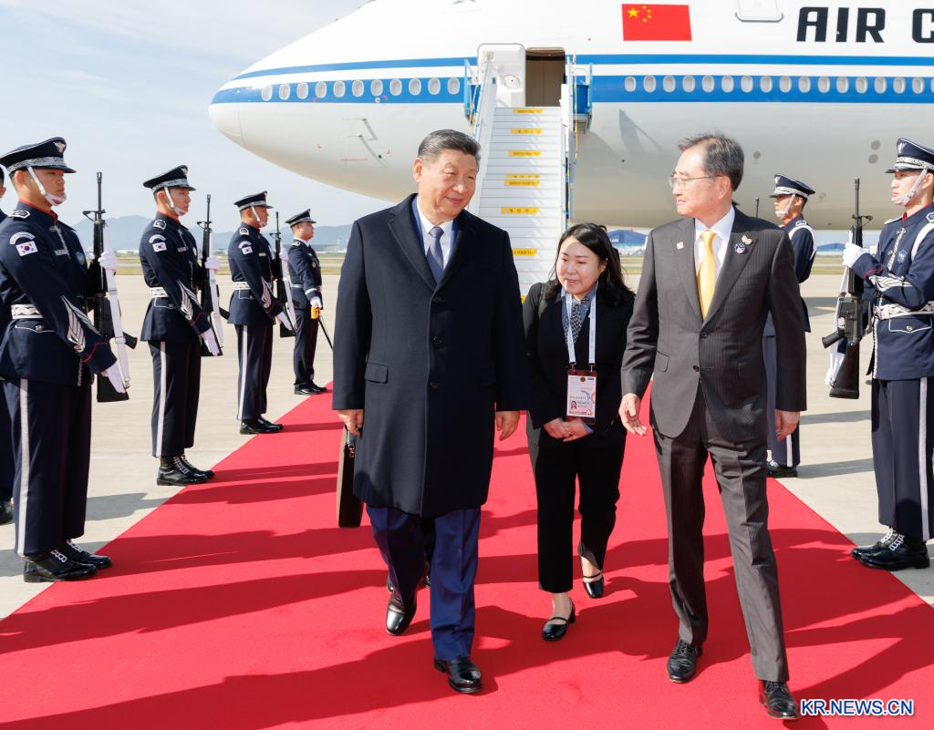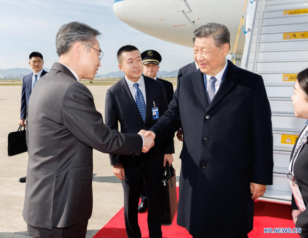 시진핑(習近平) 중국 국가주석이 이재명 한국 대통령의 초청으로 30일 오전 전용기를 타고 한국에 도착했다. 시 주석은 '제32차 아시아태평양경제협력체(APEC) 경제체 지도자회의'에 참석하고 한국 국빈 방문을 진행한다. 시 주석이 부산 김해국제공항에 도착하자 조현 한국 외교장관 등 고위급 인사들이 따뜻하게 맞이하고 있다.[촬영/신화사 기자 황징원(黃敬文)