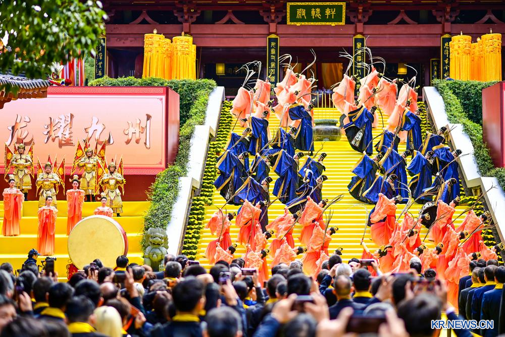 연기자가 29일 중국 선도(仙都)제사 헌원(軒轅) 황제(黄帝) 대전 현장에서 공연을 펼치고 있다.