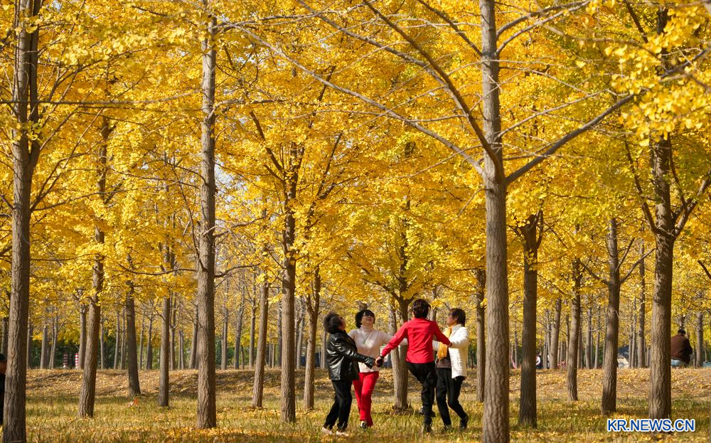 29일 산둥(山東)성 지난(濟南) 화이인(槐蔭)구의 은행나무 숲에서 즐거운 시간을 보내는 사람들.