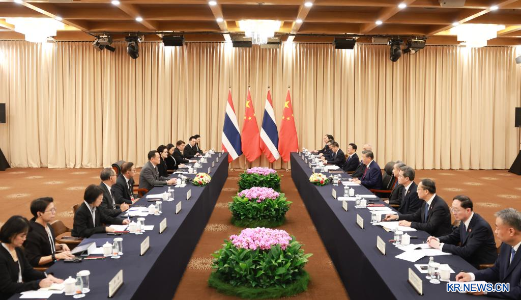 31일 오후 시진핑(習近平) 중국 국가주석이 경주에서 열린 '제32차 아시아태평양경제협력체(APEC) 경제체 지도자회의' 기간 아누틴 찬위라꾼 태국 총리와 회견했다. [촬영/ 신화사 기자 딩린(丁林)]