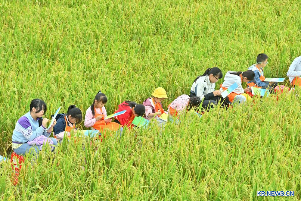 1일 광시(廣西)좡족자치구 류저우(柳州)시 류장(柳江)구의 논 풍경을 화폭에 담는 어린이들.