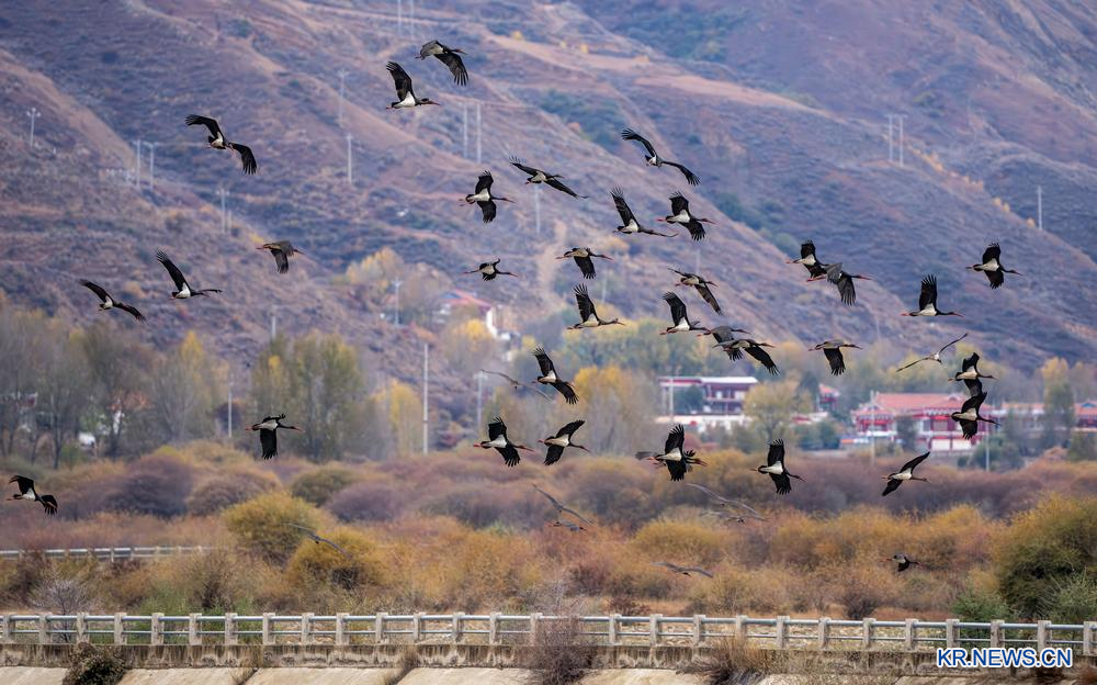 [신화망 루훠 11월4일] 최근 먹황새 무리가 쓰촨(四川)성 루훠(爐霍)현 셴수이허(鮮水河) 국가습지공원을 찾아 서식하면서 아름다운 풍경을 연출하고 있다.