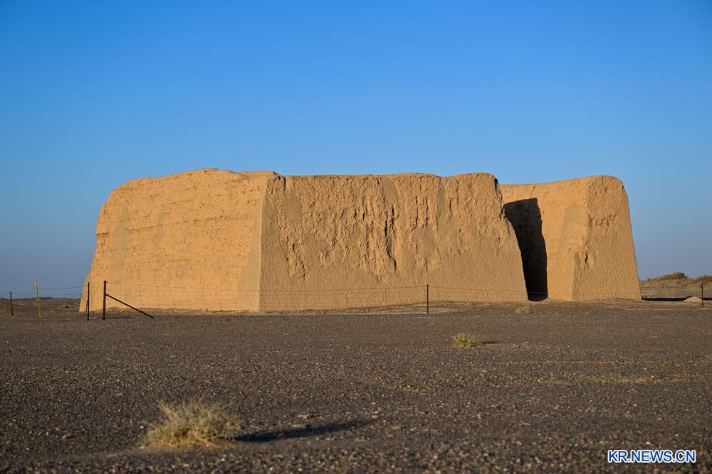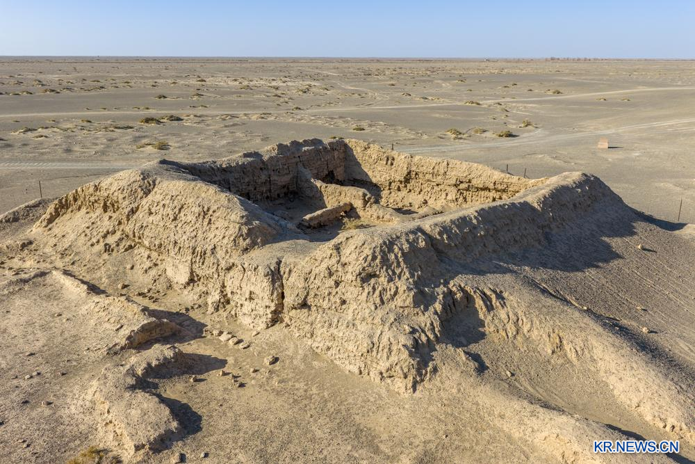 [신화망 아라산 11월5일] 3일 네이멍구(內蒙古)자치구 아라산(阿拉善)맹 어지나(額濟納)기 한나라 시대 갑거후관(甲渠候官) 유적지를 드론에 담았다.
