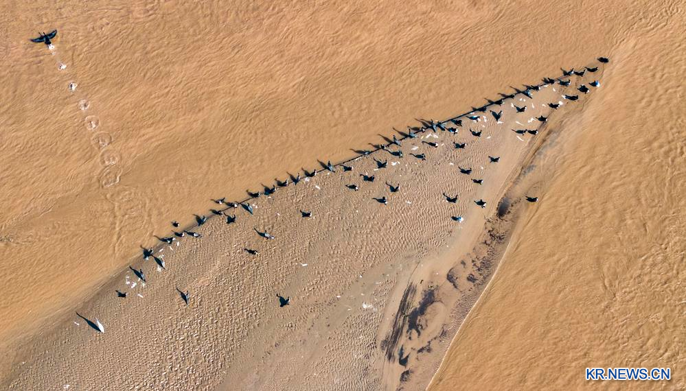 황허 닝샤 구간의 양안이 가을빛으로 물들었다. 닝샤는 최근 몇 년간 황허 유역의 생태계 보호에 힘쓰며 환경 개선을 위한 노력을 계속하고 있다. 4일 닝샤(寧夏)회족자치구 링우(靈武)시 황허(黃河)를 찾은 철새들을 드론 사진에 담았다.