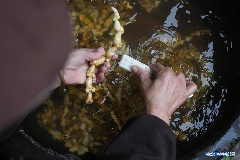 4일 마을의 한 공방에서 황정을 씻는 타이핑산촌 주민. 2025.11.5