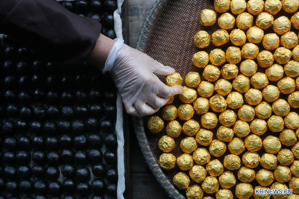 저장(浙江)성 사오싱(紹興)시 상위(上虞)구 타이핑산(太平山)촌 주민이 4일 마을의 한 공방에서 황정(黃精·죽대의 뿌리) 참깨 환을 만들고 있다.