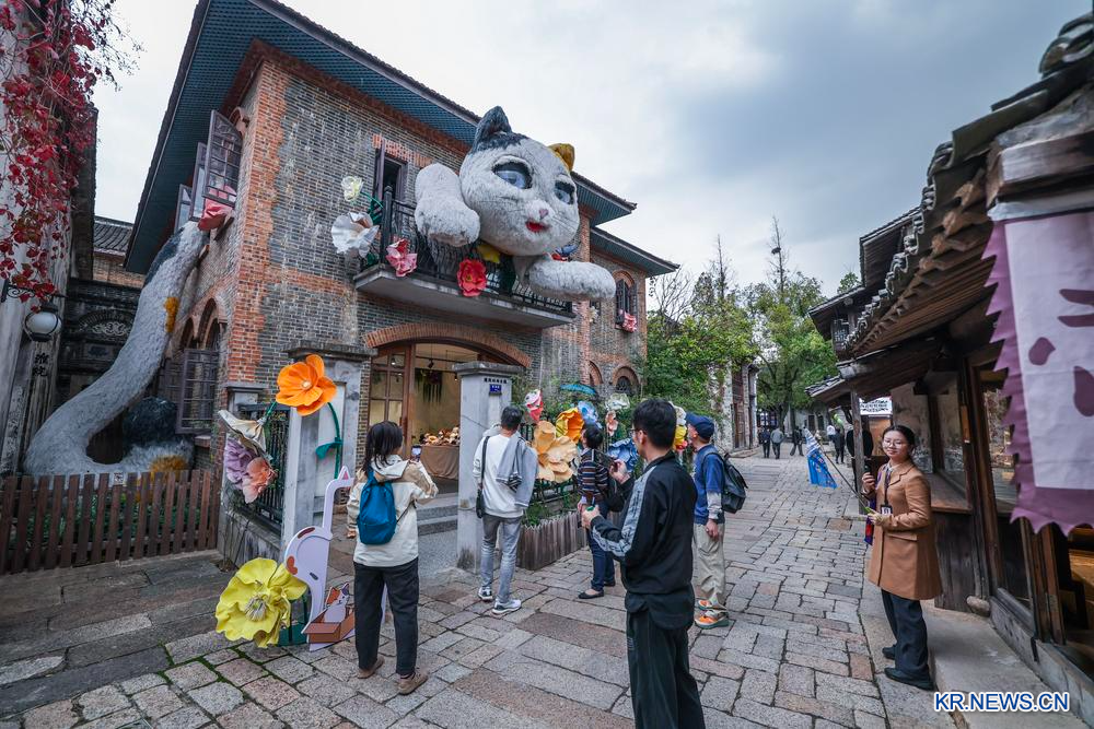 5일 저장(浙江)성 퉁샹(桐鄉) 푸위안(濮院) 패션 고진(古鎮)서 열린 '인터넷 라이프 카니발'에서 관광객들이 대형 동물 캐릭터 조형물을 살펴보고 있다.
