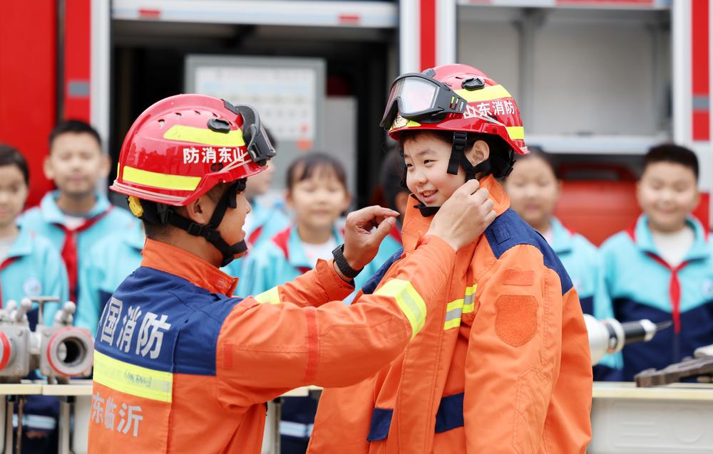 (베이징=신화통신) 7일 산둥(山東)성 린이(臨沂)시 탄청(郯城)현의 한 학교에서 소방관 보호 장비를 체험하는 초등학생.
