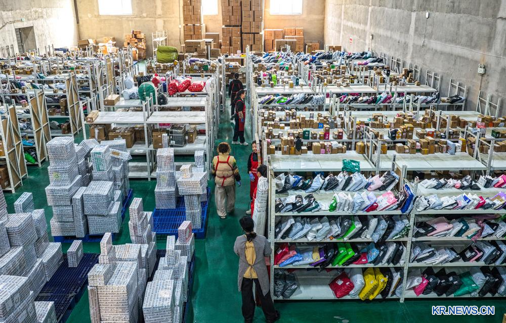 11일 산둥(山東)성 룽청(榮成)시 스다오(石島)관리구 스다오 신강(新港)국제퀵서비스관리감독센터에서 물품 정리에 한창인 모습을 드론 사진에 담았다. 2025.11.11