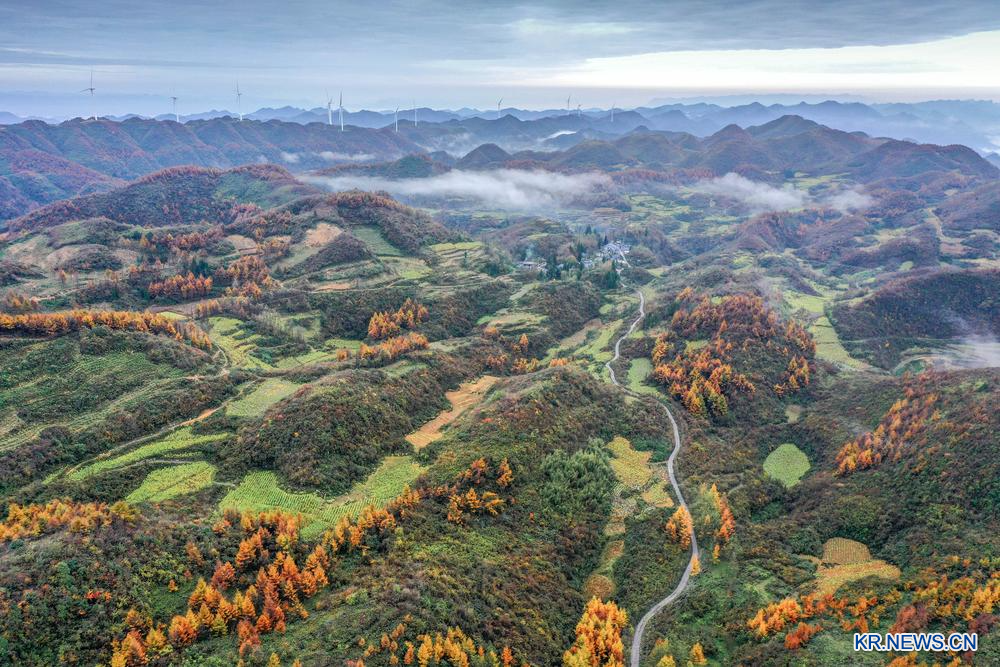 12일 후난(湖南)성 샹시(湘西)투자(土家)족먀오(苗)족자치주 룽산(龍山)현 판선(翻身)촌의 경치를 드론으로 담았다. 2025.11.12