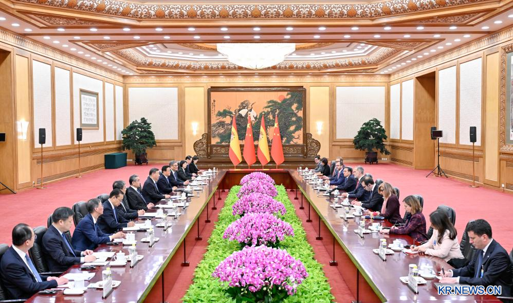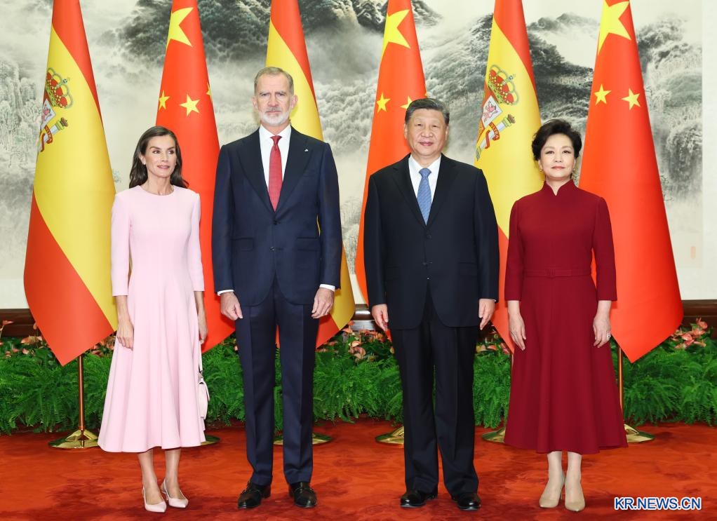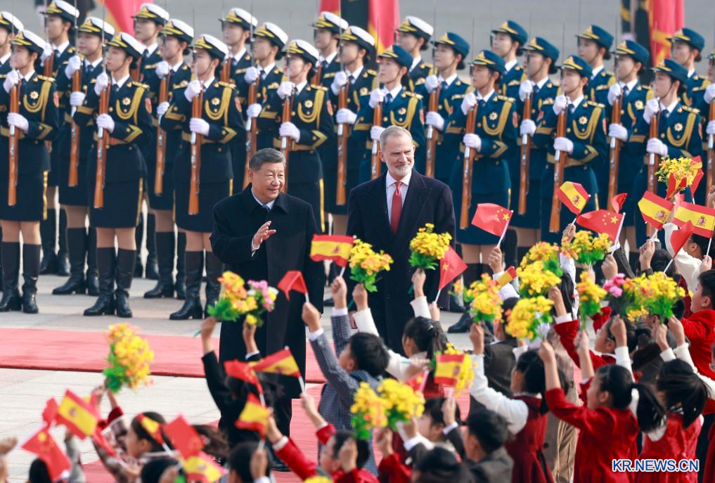 시진핑(習近平) 중국 국가주석이 12일 오전 베이징 인민대회당에서 중국을 국빈 방문한 펠리페 6세 스페인 국왕과 회견했다. 회견에 앞서 시 주석은 인민대회당 동문 밖 광장에서 펠리페 6세 스페인 국왕을 위해 환영식을 마련했다.[촬영/신화사 기자 셰환츠(謝環馳)]