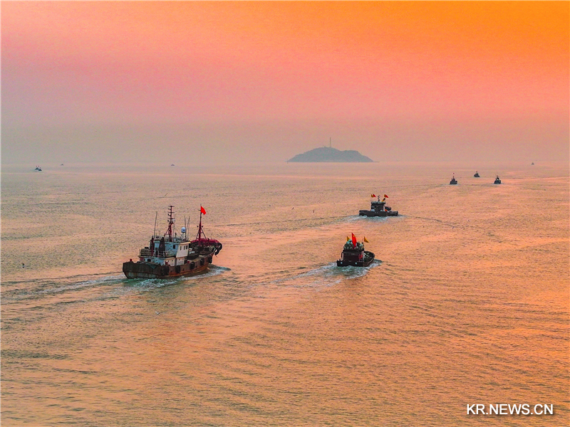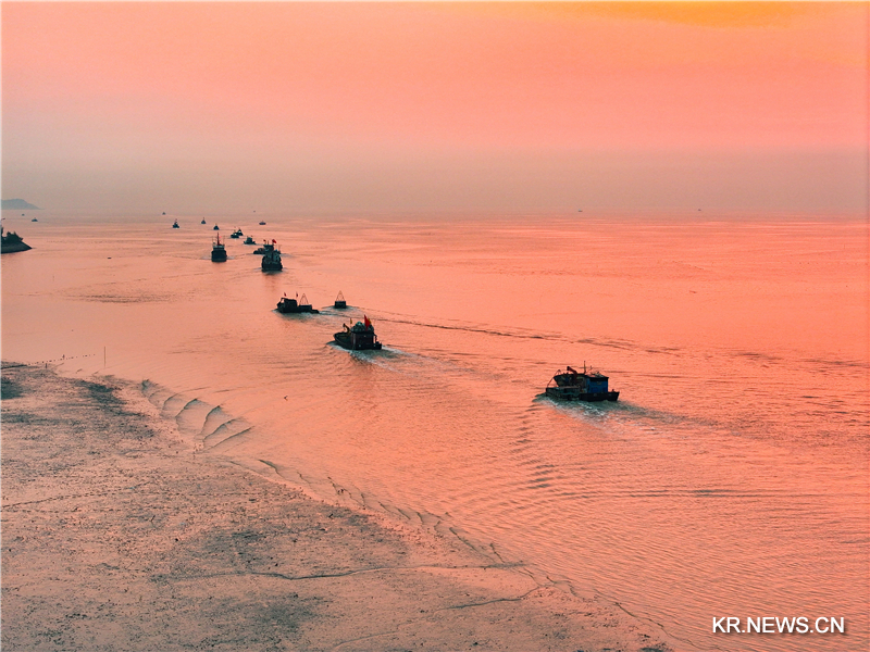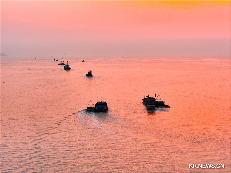 [신화망 베이징 11월15일] 최근 조업철을 맞아 장쑤성 롄윈강시 간위(赣榆)구 어민들이 아침노을을 맞으며 어선을 타고 출항해 조업을 하느라 분주한 나날을 보내고 있다.