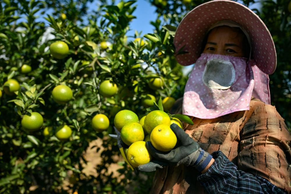 한 농민이 14일 하이난(海南)성 청마이(澄邁)현 푸청(福橙·청마이현 특산 오렌지) 재배 기지에서 푸청을 수확하고 있다.