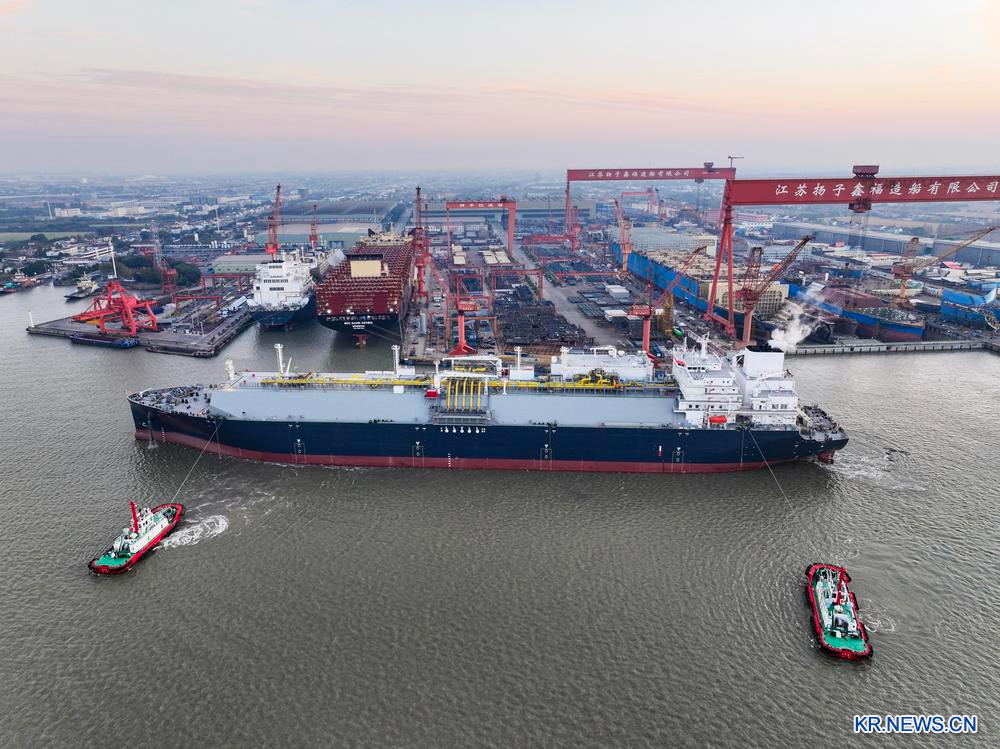 17만5천m³ 규모 LNG 운반선 '신푸(鑫福) 124'호가 20일 예인선의 도움을 받아 장쑤(江蘇) 양쯔(揚子)신푸조선회사 부두를 빠져나가는 모습을 드론에 담았다.