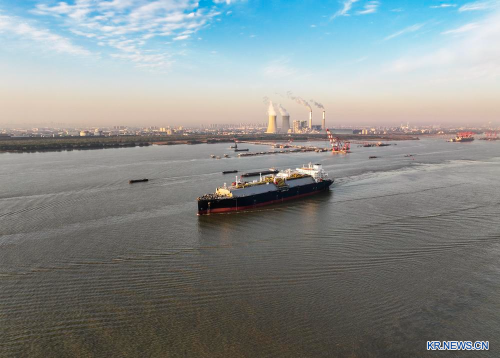 이날 창장(長江) 타이싱 구간에서 운항 중인 LNG 운반선 '신푸 124'호를 드론으로 내려다봤다. 2025.11.20