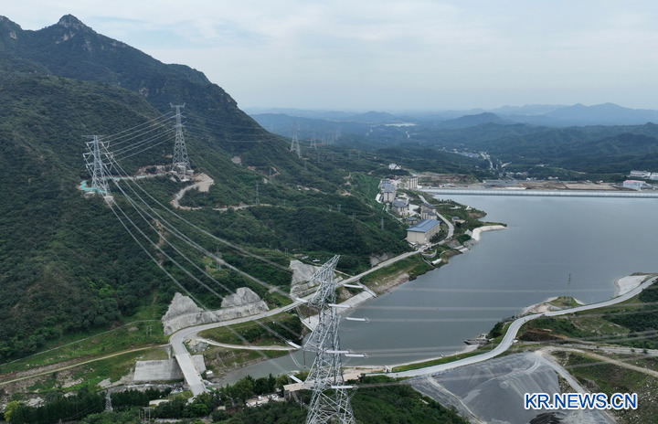 지난 8월 26일 허베이(河北)성 이(易)현에 위치한 펌핑 스토리지(양수 저장) 발전소 하부댐 인근의 전력 송출 선로를 드론으로 내려다봤다. (사진/신화통신)