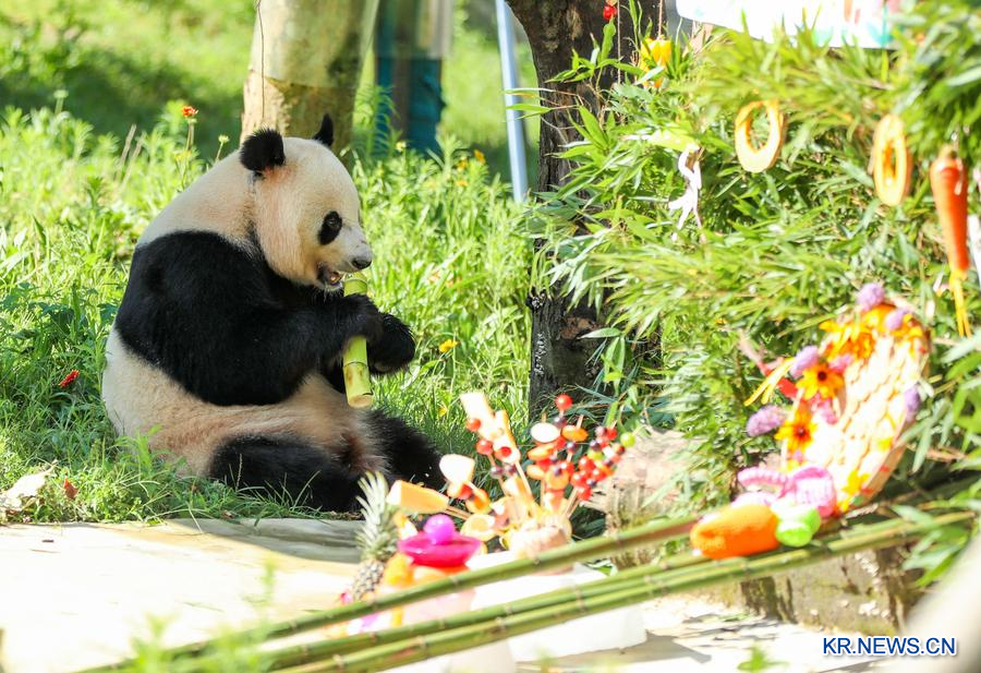지난 7월 27일 자이언트 판다 '린시(林溪)'가 쓰촨(四川)성 화잉산(華鎣山)판다원에서 먹이를 먹고 있다. (사진/신화통신)