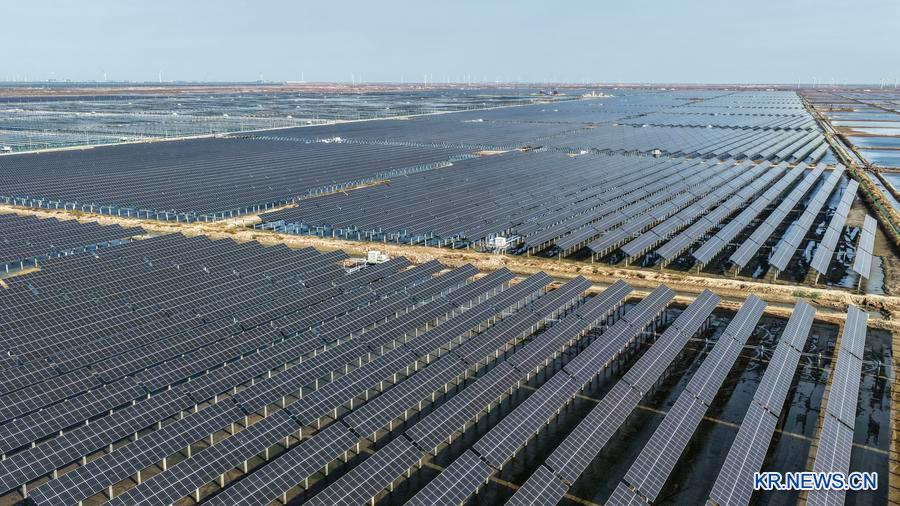 지난 16일 드론으로 내려다본 산둥(山東)성 둥잉(東營)시의 240메가와트(㎿)급 태양광 발전 프로젝트. (사진/신화통신)