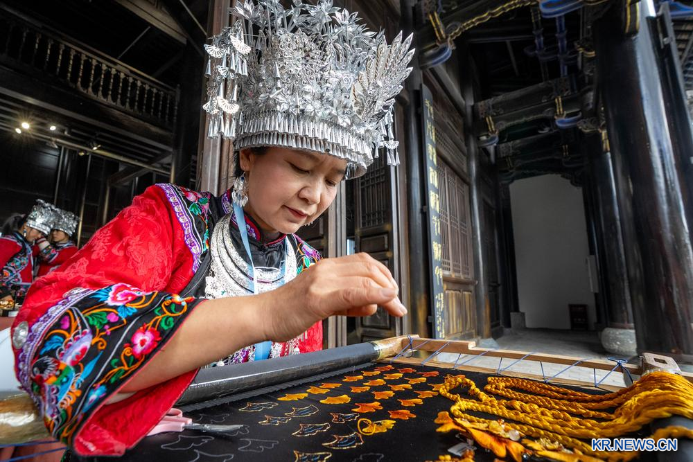 [신화망 다리 11월25일] 23일 '2025 무형문화유산 브랜드 홍보 주간' 행사에서 충칭(重慶)시 유저우(酉州)의 묘족 자수 시(市)급 전승자가 자수를 놓고 있다.