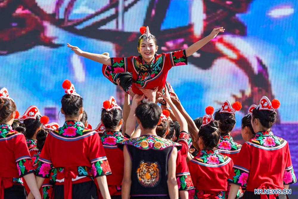 25일 윈난(雲南)성 쿤밍(昆明)시 루취안(祿勸) 이(彝)족먀오(苗)족자치현 성립 40주년 경축대회 현장에서 배우들이 공연을 펼치고 있다.