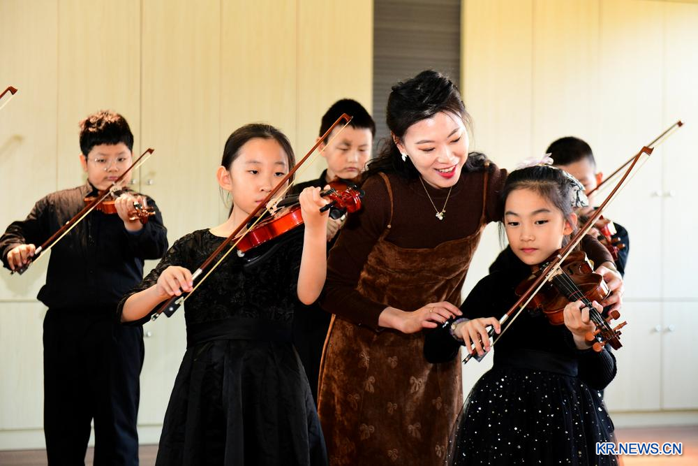26일 산둥(山東)성 지난(濟南)시 스중(市中)구의 한 초등학교에서 음악 교사가 학생에게 바이올린을 지도하고 있다.