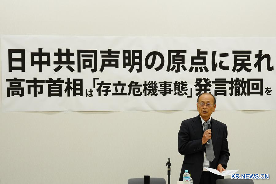 이들은 이날 저녁 도쿄 참의원 의원회관에서 집회를 열어 다카이치 총리에게 '존립 위기 사태'의 관련 발언을 철회하고 일·중 국교 정상화의 원점으로 돌아갈 것을 촉구했다. 마고사키 우케루 전 외무성 관계자는 다카이치 총리의 발언이 지난 1972년 발표한 '일·중 공동성명'을 훼손했다고 지적했다. 아오야마 가쿠인대학의 하바 쿠미코 명예교수는 다카이치 총리의 타이완 관련 발언이 매우 위험하다며 명백히 일본국 헌법 제9조를 위반하고 있으며 국제법에도 위배된다고 밝혔다.