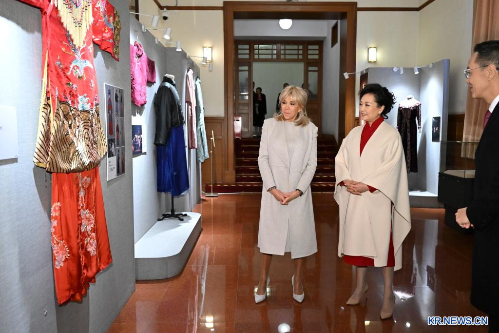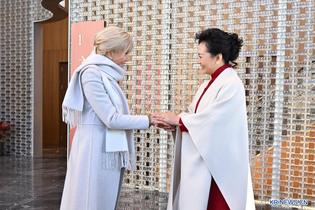 시진핑(習近平) 중국 국가주석의 부인 펑리위안(彭麗媛) 여사가 에마뉘엘 마크롱 프랑스 대통령의 중국 국빈 방문에 동행한 브리지트 여사와 4일 오전 베이징 인민예술극장을 방문했다.