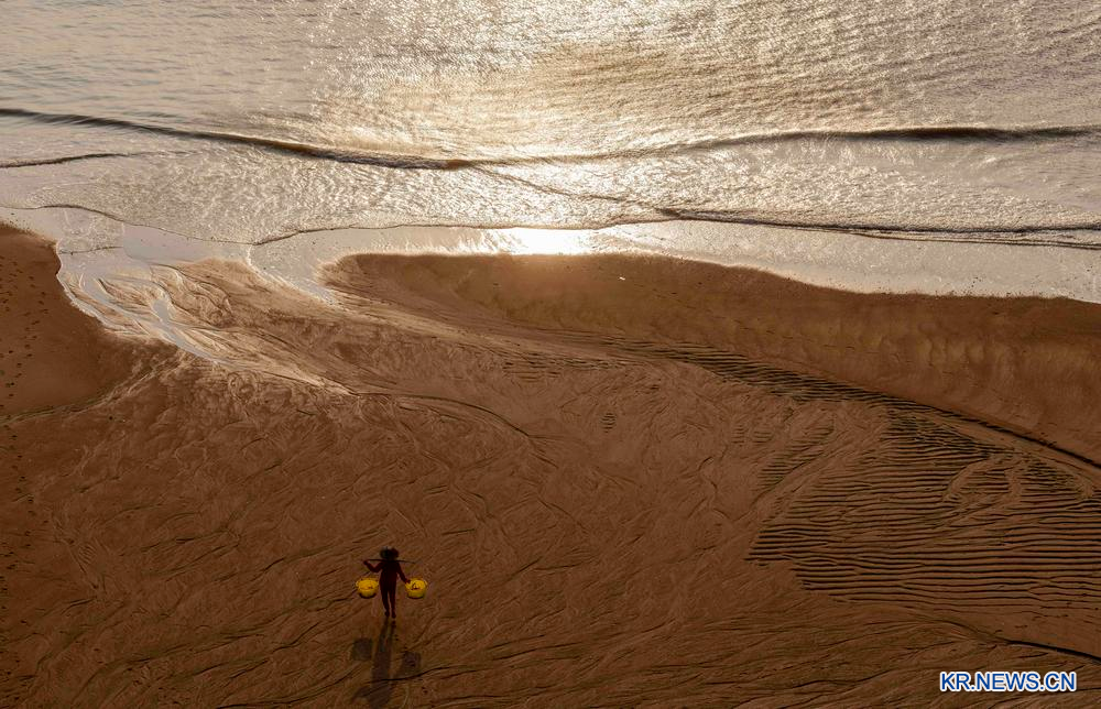 [신화망 샤푸 12월5일]4일 한 어부 출신 모델이 푸젠(福建)성 샤푸(霞浦)현 둥비(東壁)촌에 펼쳐진 갯벌 위를 걷고 있다.
