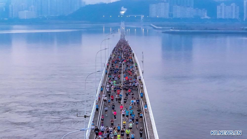 [신화망 마카오 12월8일] 7일 '2025 마카오 국제 마라톤' 참가자들이 다리 위를 달리고 있다.