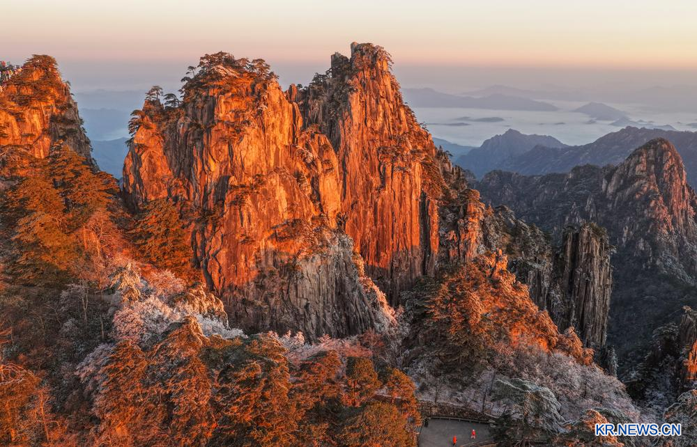 눈이 그친 뒤 은빛 설경으로 뒤덮인 안후이(安徽)성 황산(黃山) 풍경구에 아침 햇살과 독특한 지형이 어우러지며 아름다운 풍경이 연출됐다.